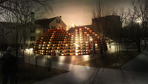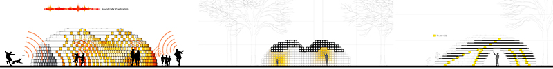 In order to strategically address the multi-directional nature of the site as well as its relationship with the yard, the overall geometry of STACKed is derived from the site itself. Guidelines, circles and axes that influence the overall form of the installation were generated using the center point of the Radcliff Yard as well as critical viewpoints from the adjacent roads. From the overall spherical massing of STACKed, two sweeping geometries are carved out in order to create two zones of activity: an outdoor theater and an exhibition tunnel. Each zone of activity is further augmented using programmable lighting embedded inside the installation components that responds to the environment and people (noise and proximity).